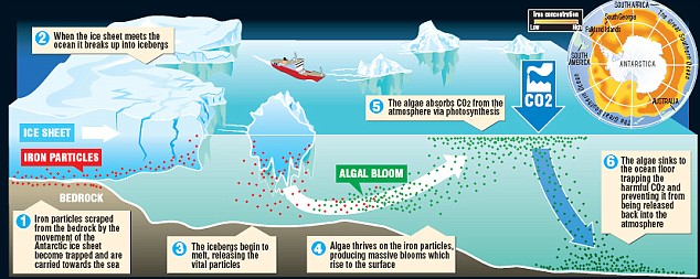 冰山消融成為全球變暖的重要標志,但是英國科學(xué)家發(fā)現(xiàn),冰山中含有豐富的鐵質(zhì)顆粒,冰山消融,鐵質(zhì)顆粒被釋放進海洋,從而促進海藻的生長,大量的海藻可以吸收二氧化碳并將它沉淀在深海里,這種過程可以延緩或者阻止全球變暖。