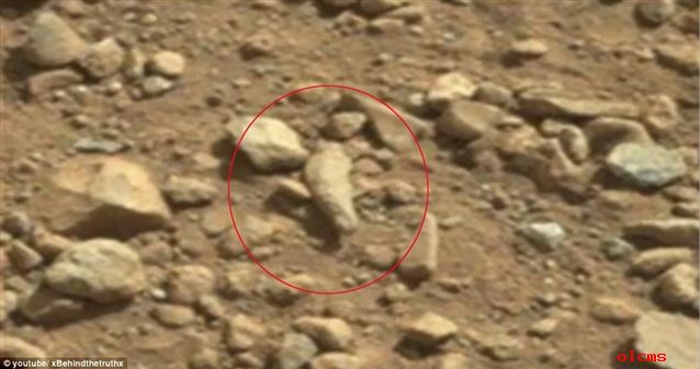 報(bào)道稱,一些獵奇者們宣稱,在一張“好奇號(hào)”發(fā)回的照片上,有一顆圓形的石頭,大概有人手指頭那樣長(zhǎng),而且有和人手指頭一樣的曲線;而另一張照片顯示,一個(gè)像穿破的鞋子的石頭倒放在火星巖石之中;