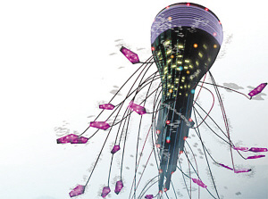 底部的熒光觸須有三大作用:第一,與海潮的擺動節(jié)奏相同,可以產(chǎn)生和積蓄能量;第二,是建筑物的平衡和穩(wěn)定系統(tǒng),借助它的輕輕擺動,大樓能保持垂直豎立狀態(tài);第三,為大量海底動物提供聚居場所。