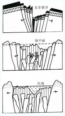 由于斷層作用,地表有些地區(qū)斷裂成許多部分,出現(xiàn)許多斷裂地塊,有的地塊上升,有的地塊下降。紅海就是斷裂形成的。