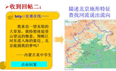 【設(shè)計意圖】創(chuàng)設(shè)與學生生活貼近的情境,充分利用小組內(nèi)和小組間的互助學,引導(dǎo)學生利用地圖分析北京的自然環(huán)境。提出北京成為古都的優(yōu)勢這一問題,激勵學生進行深度思考和研究,領(lǐng)會各自然要素之間的聯(lián)系,教會學生舉一反三的分析方法,并把這一方法應(yīng)用到其它區(qū)域的學習中去。
