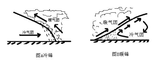 冷鋒是冷氣團(tuán)主動(dòng)向暖氣團(tuán)移動(dòng)的鋒(如圖A)。在圖中冷氣團(tuán)部分一般畫有冷氣團(tuán)向前推進(jìn)的方向箭頭,它與暖氣團(tuán)在鋒面上被迫抬升的氣流運(yùn)動(dòng)箭頭方向相反。暖鋒是暖氣團(tuán)主動(dòng)向冷氣團(tuán)移動(dòng)的鋒(如圖B)。在圖中,暖氣團(tuán)沿鋒面爬升的氣流方向箭頭,與鋒面另一側(cè)的冷氣團(tuán)移動(dòng)的方向是一致的。由此,可借助于冷氣團(tuán)的箭頭方向來判別冷、暖鋒。