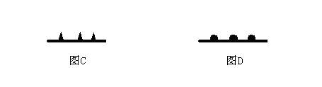 冷鋒用線條加(黑)三角表示,三角形標(biāo)在暖氣團(tuán)一側(cè),如圖C為冷鋒符號(hào)。而暖鋒用線條加(黑)半圓表示,半圓標(biāo)在冷氣團(tuán)一側(cè)。如圖D為暖鋒符號(hào)。