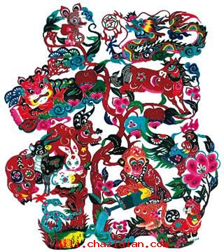 河北蔚縣剪紙,據史書記載,蔚縣剪紙始于清朝道光年間,迄今已有一百五十多年的歷史。蔚縣人一般把剪紙稱為"窗花"。以窗花見長,“天皮亮”可說是最早的窗花形式,即在云母薄片上繪圖著色進行裝飾。早期當地還盛行供花鞋、荷包、枕頭上刺繡用的“花樣”。后來河北武強縣的木版水印窗花傳入,吸取其色彩特點,仿“天皮亮”透明效果,以刻代剪,形成蔚縣剪紙的獨特風格。蔚縣剪紙以“陰刻”和“色彩點染”為主,故有“三分工七分染”之說。代表人物是王老賞(1890—1951)。蔚縣剪紙的題材,多取自戲曲人物,也有花草魚蟲、飛禽走獸等吉祥形象。