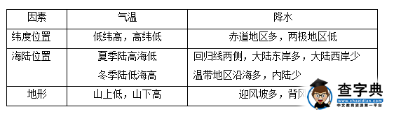 1、影響因素:緯度位置、海陸位置、地形是影響氣溫和降水的主要因素,它們因此也成為影響氣候的主要因素。