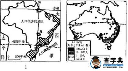 (1)圖1代表國家是 ,圖2代表國家是 ;根據(jù)圖分析兩國人口分布的共同特征是 。從經(jīng)濟發(fā)展水平來看,1 是國家,2 是國家,兩國均大量出口礦產(chǎn)資源是 。