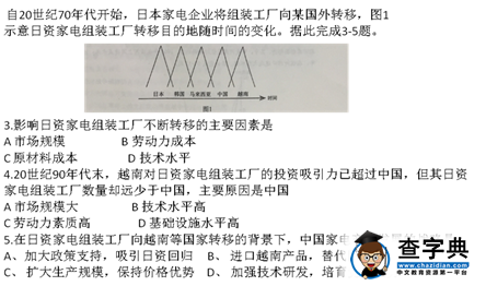 【楊翌老師解析】第二組題,三到五題。我們從20世紀(jì)70年代開(kāi)始日本家電企業(yè)組裝,圖一示意的日資家電組裝工廠,我們能看到隨著時(shí)間的變更,大體上由日本轉(zhuǎn)移到韓國(guó),又到馬來(lái)西亞、到中國(guó)、到云南,完全是按照整個(gè)國(guó)家的發(fā)展趨勢(shì),然后逐漸的由較發(fā)達(dá)地區(qū)向較為落后的國(guó)家轉(zhuǎn)移,所以說(shuō)影響日資家電產(chǎn)業(yè)不斷轉(zhuǎn)移的主要因素第一道題應(yīng)該是B,因?yàn)榘l(fā)展中國(guó)家和相對(duì)落后的國(guó)家,勞動(dòng)力成本肯定是較轉(zhuǎn)出國(guó)家要便宜的。我們看這個(gè)大體的趨勢(shì),為了市場(chǎng)規(guī)模和技術(shù)水平進(jìn)行一個(gè)轉(zhuǎn)移的。像原材料成本,因?yàn)槲覀兦懊嬉呀?jīng)界定了這是一個(gè)家電的組裝廠,所以原材料的成本相對(duì)而言是沒(méi)有明確指向的。第二個(gè)說(shuō)20世紀(jì)90年代末,越南對(duì)日資家電組裝工廠數(shù)量多于中國(guó),但是人少于中國(guó),這是為什么。我們前面強(qiáng)調(diào)了越南和中國(guó)的比較問(wèn)題,而且時(shí)間點(diǎn)確定在了20世紀(jì)90年代末期,我們可以回想一下當(dāng)時(shí)的中國(guó)是什么狀態(tài),我們不可能是技術(shù)水平超高,我們的勞動(dòng)力素質(zhì)也沒(méi)有特別明顯的指向,但是跟越南不一樣的是,我們的市場(chǎng)是非常廣大的,或者我們的市場(chǎng)前景非常廣大,所以答案選A。尤其是基礎(chǔ)設(shè)施水平和勞動(dòng)力素質(zhì),這三方面都是要建立在整個(gè)國(guó)家經(jīng)濟(jì)相對(duì)發(fā)達(dá)的基礎(chǔ)上,來(lái)去進(jìn)行考慮的。而當(dāng)時(shí)的時(shí)間背景是20世紀(jì)90年代末期,中國(guó)正處在發(fā)展的階段,所以沒(méi)有明確的指向。而跟越南比較的話只能是從國(guó)力、人口數(shù)量、市場(chǎng)前景進(jìn)行比較。