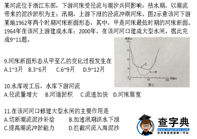 我們?cè)賮?lái)看一下最后一組題,這個(gè)是考到了河流的開(kāi)發(fā)和整治的問(wèn)題,包括后面有一道簡(jiǎn)答題也是跟這個(gè)相關(guān)的。某河流位于浙江的東部,枯水期以潮流帶來(lái)的泥沙瘀積為主,汛期上游下瀉的徑流沖刷河床。材料中其實(shí)告訴你了,我給大家簡(jiǎn)單分析一下,這個(gè)圖看起來(lái)比較復(fù)雜,但是材料中告訴你枯水期以瘀積為主,豐水期以沖刷為主。水少的時(shí)候泥沙開(kāi)始堆積,所以其實(shí)前面給你的語(yǔ)言就是告訴你這個(gè)事。圖中有兩條線,一個(gè)是甲,一個(gè)是乙。我們知道如果河流越寬,說(shuō)明水量越大,河流越窄的話相當(dāng)于水量越小。同時(shí)按照高度,高度既然是河床的話,因此甲是最低的河床,所以甲肯定是河床最低,應(yīng)該是豐水期。乙的話應(yīng)該是枯水,所以告訴你的材料其實(shí)就指的是這個(gè)意思。我們既然有甲到乙,其實(shí)就是由豐水期到枯水期的過(guò)程,前面又限定了地理位置是浙江東部,9月份一個(gè)月就撤出我國(guó)了,江水對(duì)河流的補(bǔ)給應(yīng)該是九月份之后,所以我們選擇9到12月的選項(xiàng)。