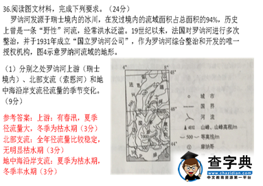 【楊翌老師解析】接著看36題,我們說(shuō)羅訥河發(fā)源于瑞士境內(nèi)的冰川,材料中說(shuō)占流域面積的49%,也經(jīng)常洪水泛濫,法國(guó)進(jìn)行多次的整治,并于1931年成立了羅訥河公司。我們看下面是一個(gè)地形分布圖,拿到一個(gè)圖的時(shí)候先來(lái)看材料,材料的部分我們看到有德國(guó)、摩納哥,有等高線,有山脈,有河流,有國(guó)界,有城市,圖例對(duì)我們一道題的決定性非常高,換句話說(shuō)如果這道題不考這個(gè)知識(shí)點(diǎn)就不會(huì)列這些圖例了,所有列的圖例都是有用的。所以按照我們的思路來(lái)看,第一題說(shuō)讓分別分析上游,瑞士和北部的支流,還有地中海沿岸的變化。要想回答的前提你首先要明白河流的補(bǔ)給類型,還有對(duì)應(yīng)的氣候。比如說(shuō)高一的同學(xué),我們地球儀學(xué)過(guò)了氣候類型的分布,我們有一個(gè)標(biāo)準(zhǔn)的模型分布,按照大陸西岸來(lái)看,尤其是西歐部分,40度往南,應(yīng)該是地中海氣候,冬天降水,夏天不降水。我們也就想到了既然是地中海沿岸的支流,該河流主要的補(bǔ)給類型應(yīng)該以雨水,我們一條河流一共有五種補(bǔ)給類型,雨水補(bǔ)給、積雪溶水、冰川、地下水和湖泊水。每一條河流都至少有一種補(bǔ)給類型,因?yàn)槿绻粭l河流連地下水都沒(méi)有就干了。按照補(bǔ)給類型來(lái)看,可能一條河流有多種的補(bǔ)給類型,但是往往我們考察的都是主要的,主要的補(bǔ)給就是雨水。如果沒(méi)有雨水我們會(huì)想到積雪、冰川,然后才是地下水補(bǔ)給。湖泊水補(bǔ)給呢,因?yàn)楹恿骱秃吹难a(bǔ)給是互相的關(guān)系,你水多了分我點(diǎn)。往往湖泊的形成如果跟河流是蓄水池的感覺(jué),河流水量少的話,基本上就沒(méi)有了,所以是互相補(bǔ)給的關(guān)系。往往有湖泊水補(bǔ)給的地方,普遍現(xiàn)象都是降水量比較豐富的地區(qū),水流量比較大。湖泊水和河流水都是相伴而生的,所以我們答題的時(shí)候主要側(cè)重于雨水補(bǔ)給,季節(jié)性的積雪融水或者冰川,如果都沒(méi)有我們?cè)偌右粋€(gè)地下,地下水是最后想到的,如果你不確定的話你也要寫上,因?yàn)閷戝e(cuò)是不扣分的??隙ㄊ且杂晁a(bǔ)給為主,我們就知道地中海沿岸的支流和北部的支流,因?yàn)榭勘本暥绕?,普遍?lái)講都是溫海洋氣候,全年都降水,北部的支流基本上所在的地理位置就應(yīng)該是溫海洋氣候,沒(méi)有明顯的枯水期。河流的上游地區(qū)應(yīng)該是以山上的積雪融水補(bǔ)給為主。而且它的發(fā)源地,旁邊有一個(gè)山脈,大體的海拔高度標(biāo)了4000多米,說(shuō)明它上面有冰雪,所以雪什么時(shí)候融化呢?應(yīng)該是春天,包括很多同學(xué)在秦嶺淮河以北的地帶,基本上冬天都會(huì)降水,春天都會(huì)有積雪的融化,所以上游地區(qū)有春汛,冬季為枯水期,往往存在于這種季節(jié)分布的一個(gè)情況。