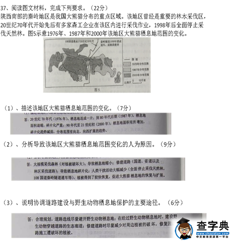 然后看下一道題,分析導(dǎo)致該地區(qū)大熊貓棲息地范圍變化的人為原因是什么?我們看一下材料,材料中有一個(gè)先后有多家森工企業(yè)在該地區(qū)進(jìn)行采伐作業(yè),從1998年停止了,所以說(shuō)人的因素是有的,人類活動(dòng)永遠(yuǎn)會(huì)影響生物活動(dòng)的,所以我們大的時(shí)候肯定有一個(gè)大規(guī)模的采伐森林。同時(shí)圖中有一個(gè)隧道,也是人類活動(dòng),第三個(gè)就是人類活動(dòng)干擾,大幅度的減小,植被破壞,得到了恢復(fù)才能促進(jìn)發(fā)展。