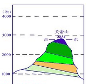 黃土高原山區(qū)山地植被垂直帶譜(山西呂梁山,從上倒下依次為:亞高山灌叢帶--山地落葉松林帶--山地針闊混交林帶--山地松林帶--草原帶)