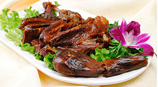 樟茶鴨屬熏鴨的一種,制作考究,要求嚴(yán)格,成菜色澤金紅,外酥里嫩,帶有樟木和茶葉的特殊香味,是四川經(jīng)典的漢族傳統(tǒng)名肴之一,屬于川菜。此菜選料嚴(yán)謹(jǐn),制作精細(xì)。