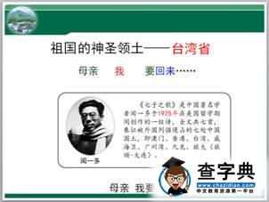 利用最后一句歌詞,讓學(xué)生說(shuō)出歌詞中的“母親”“我”分別指的是“祖國(guó)”和“臺(tái)灣省”,然后提問(wèn)為什么“臺(tái)灣省”說(shuō)“我要回來(lái)”?課件展示聞一多先生的寫(xiě)作背景,讓學(xué)生結(jié)合教材中的閱讀材料“臺(tái)灣是祖國(guó)領(lǐng)土的一部分”,讓學(xué)生認(rèn)識(shí)到臺(tái)灣是祖國(guó)不可分割的領(lǐng)土,增強(qiáng)學(xué)生的領(lǐng)土意識(shí)及愛(ài)國(guó)情感。