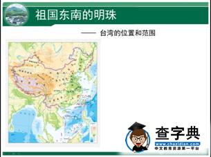 展示臺(tái)灣省在中國(guó)的位置,由全局圖得出臺(tái)灣是“祖國(guó)東南的明珠”,進(jìn)而明確臺(tái)灣省位于祖國(guó)的東南部,引出本小節(jié)的第一部分內(nèi)容──臺(tái)灣省的位置和范圍。