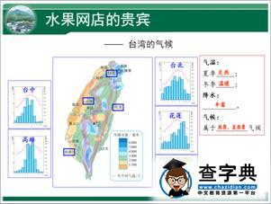 設(shè)置一個(gè)場(chǎng)景:我要為一個(gè)面向祖國(guó)大陸的臺(tái)灣水果網(wǎng)店打廣告,老師用夸張的語(yǔ)氣依次介紹水果,最后挑出其中一種水果,展示其生長(zhǎng)習(xí)性,引出本小節(jié)的內(nèi)容──臺(tái)灣省的氣候。