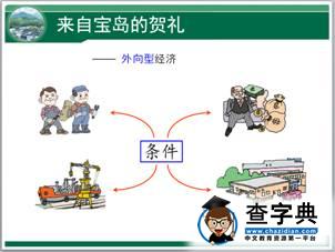 讓學(xué)生閱讀 “臺(tái)灣出口導(dǎo)向型經(jīng)濟(jì)發(fā)展的有利因素”示意圖,然后合上書(shū),要求學(xué)生用自己的語(yǔ)言來(lái)描述PPT所展示的四張圖片的含義,引導(dǎo)學(xué)生用他們的語(yǔ)言說(shuō)出臺(tái)灣發(fā)展外向型經(jīng)濟(jì)的幾個(gè)有利條件。