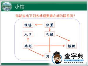 由于是初中學(xué)生,所以關(guān)聯(lián)的設(shè)置都為單向性的,分別如下:位置對(duì)氣候的影響,位置對(duì)經(jīng)濟(jì)的影響,氣候?qū)χ脖坏挠绊?,氣候?qū)恿鞯挠绊懀匦螌?duì)河流的影響,地形對(duì)植被的影響,地形對(duì)人口分布的影響。其他只要合理,老師可以在PPT中加上,可以依據(jù)學(xué)生的回答情況調(diào)整PPT內(nèi)容。(在學(xué)生回答的過(guò)程中,一定要讓學(xué)生用他們自己的語(yǔ)言來(lái)進(jìn)行描述,然后老師加以引導(dǎo),在老師的引導(dǎo)下,讓他們自己將正確的答案說(shuō)出來(lái)。)