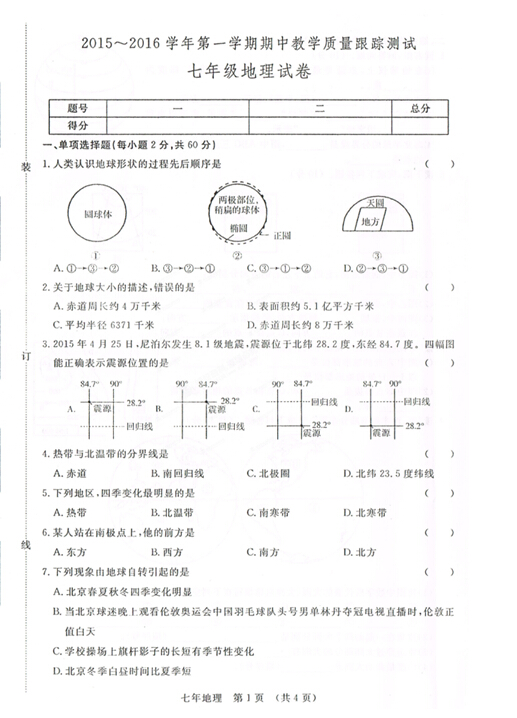 期中考試來襲,各位同學(xué)們可準(zhǔn)備好過“期中考”這個大關(guān)了嗎?別著急,查字典地理網(wǎng)為你整理期中試卷,希望能幫助你取得好成績!