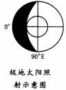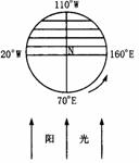 解析:此題是考查學(xué)生對(duì)所學(xué)知識(shí)的運(yùn)用能力,要求學(xué)生正確理解地球運(yùn)動(dòng)與陽(yáng)光照射關(guān)系的變化,并用圖示的方式,直觀地反映地球在空間的狀況,才能解決圖中的問(wèn)題。晨昏圈是陽(yáng)光照射的結(jié)果,故太陽(yáng)光一定和晨昏圈保持垂直的關(guān)系,且畫(huà)在晝半球的外側(cè)。據(jù)地球自轉(zhuǎn)方向和同緯度地區(qū)跨過(guò)晨昏線(xiàn)時(shí)的晝夜變化,確定是晨線(xiàn)還是昏線(xiàn)。赤道上終年晝夜平分,故赤道與晨昏線(xiàn)的交點(diǎn)一定是6點(diǎn)或18點(diǎn)。依據(jù)經(jīng)度相差1度,地方時(shí)相差4分鐘的對(duì)應(yīng)關(guān)系,北京時(shí)間和東經(jīng)73029'的地方時(shí)即可推出,也說(shuō)明經(jīng)度不同地方時(shí)有分秒之差(以圖中左側(cè)最外面的經(jīng)線(xiàn)為00,可推出E所在經(jīng)度為900E)。經(jīng)度相同,地方時(shí)也相同。