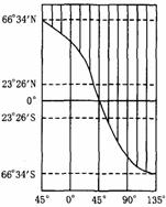 解析:此題通過(guò)考查晨昏線(xiàn)與經(jīng)線(xiàn)的關(guān)系,進(jìn)一步考查了地球在公轉(zhuǎn)過(guò)程中晝夜長(zhǎng)短變化的知識(shí)。在春分和秋分的時(shí)候,太陽(yáng)直射赤道,晨昏線(xiàn)(或晨昏圈)通過(guò)南北兩極,晨昏線(xiàn)(或晨昏圈)和經(jīng)線(xiàn)才能重合,和緯線(xiàn)直交。其他時(shí)候晨昏線(xiàn)(或晨昏圈)都和經(jīng)線(xiàn)斜交,并在冬至日和夏至日的時(shí)候其交角達(dá)到最大(最大為 )。
