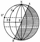 解析:東西半球的范圍是從西經(jīng)20度向東到東經(jīng)160度,如果東半球全部處于晝半球,說(shuō)明晨線(xiàn)和西經(jīng)20度重合,昏線(xiàn)和東經(jīng)160度重合。這時(shí)應(yīng)是春分或秋分的時(shí)候,西經(jīng)20度的地方時(shí)是6時(shí),東經(jīng)160度的地方時(shí)是18時(shí),北京時(shí)間是東八區(qū)的區(qū)時(shí)也是東經(jīng)120度的地方時(shí),應(yīng)是15時(shí)20分。如下圖所示。(陰影部分表示黑夜)